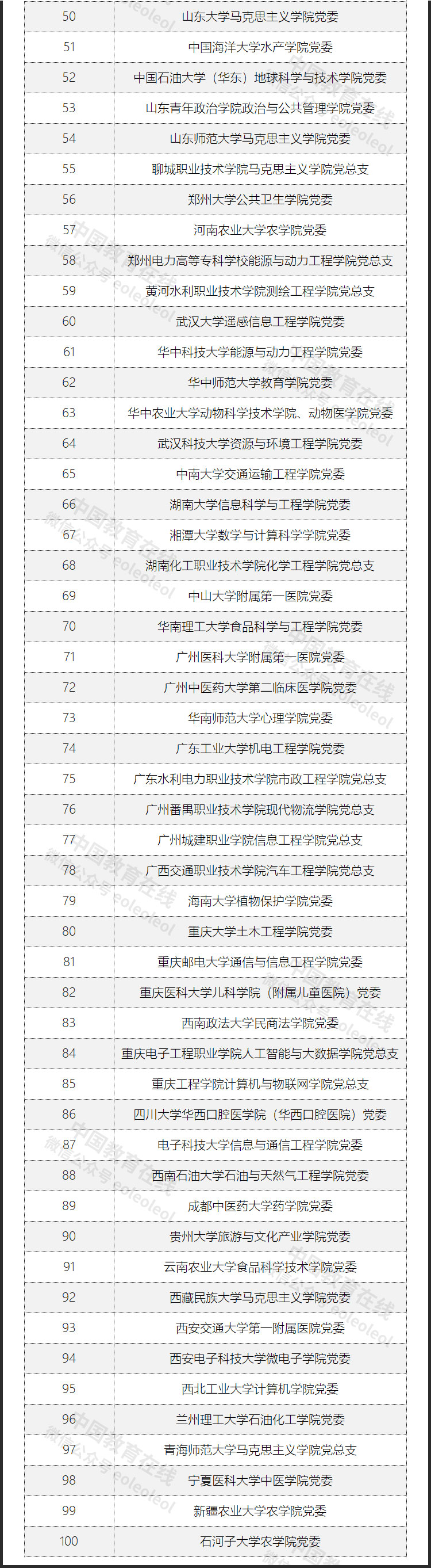 近日,教育部公布第三批全國黨建工作示范高校、標(biāo)桿院系、樣板支部培育創(chuàng)建單位名單。經(jīng)省級(jí)黨委教育工作部門推薦、資格審查、專家推薦、教育部黨的建設(shè)和全面從嚴(yán)治黨工作領(lǐng)導(dǎo)小組成員單位集中審議、結(jié)果公示,共遴選產(chǎn)生了11個(gè)全國黨建工作示范高校、100個(gè)全國黨建工作標(biāo)桿院系、1000個(gè)全國黨建工作樣板支部培育創(chuàng)建單位。