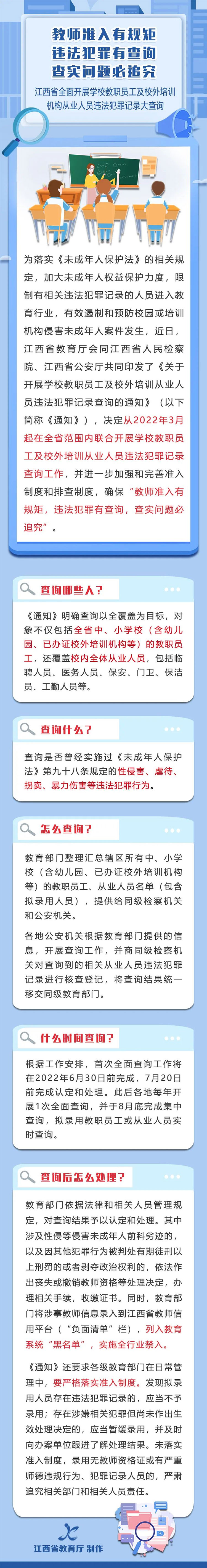近日,江西省教育廳會(huì)同江西省人民檢察院、江西省公安廳共同印發(fā)了《關(guān)于開展學(xué)校教職員工及校外培訓(xùn)從業(yè)人員違法犯罪記錄查詢的通知》(以下簡(jiǎn)稱《通知》),決定從2022年3月起在全省范圍內(nèi)聯(lián)合開展學(xué)校教職員工及校外培訓(xùn)從業(yè)人員違法犯罪記錄查詢工作,并進(jìn)一步加強(qiáng)和完善準(zhǔn)入制度和排查制度,確?!敖處煖?zhǔn)入有規(guī)矩,違法犯罪有查詢,查實(shí)問題必追究”。