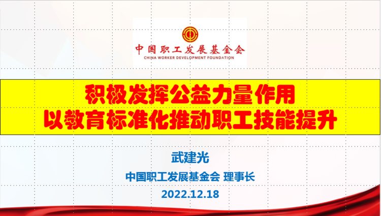 中國(guó)職工發(fā)展基金會(huì)理事長(zhǎng)武建光的報(bào)告主題是《積極發(fā)揮公益力量作用,以教育標(biāo)準(zhǔn)化推動(dòng)職工技能提升》。他指出:我國(guó)技能人才總量超過(guò)2億人,其中高技能人才數(shù)量從2016年底的4791萬(wàn)人增長(zhǎng)到2021年底的6000萬(wàn)人。修訂之后的《職業(yè)教育法》要求工會(huì)“應(yīng)當(dāng)依法履行實(shí)施職業(yè)教育的義務(wù),參與、支持或者開(kāi)展職業(yè)教育”。中國(guó)職工發(fā)展基金會(huì)作為全國(guó)總工會(huì)主管的公益組織,為更好地服務(wù)職工職業(yè)教育和技能培訓(xùn),設(shè)立了“職工新技能培訓(xùn)專項(xiàng)基金”,以發(fā)揮公募基金優(yōu)勢(shì),動(dòng)員社會(huì)力量廣泛參與。在論壇舉辦期間,教育標(biāo)準(zhǔn)專業(yè)委員會(huì)常務(wù)理事單位——江蘇匯博機(jī)器人技術(shù)股份有限公司向基金會(huì)捐贈(zèng)200萬(wàn)元,全部用于職工技能提升,服務(wù)國(guó)家戰(zhàn)略,推動(dòng)區(qū)域協(xié)調(diào)發(fā)展。