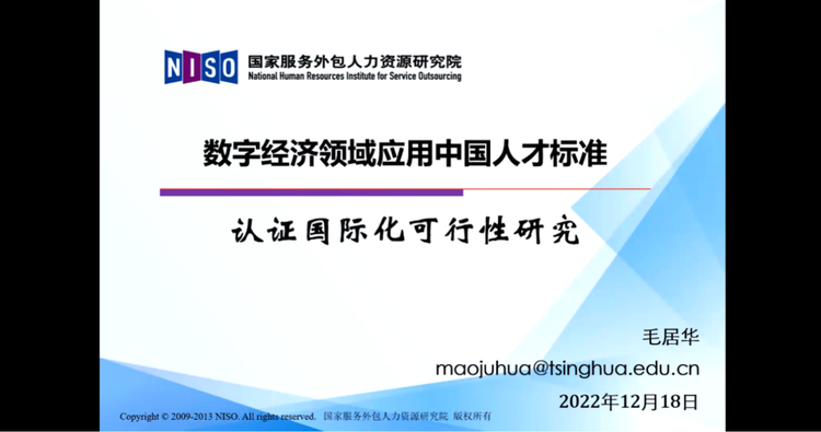 清華大學(xué)國(guó)家服務(wù)外包人力資源研究院副院長(zhǎng)毛居華教授的報(bào)告主題是《數(shù)字經(jīng)濟(jì)領(lǐng)域應(yīng)用中國(guó)人才標(biāo)準(zhǔn)的認(rèn)證國(guó)際化可行性研究》。他從標(biāo)準(zhǔn)化研究和認(rèn)證可行性兩個(gè)方面進(jìn)行研究闡述:在標(biāo)準(zhǔn)研究方面,他總結(jié)了國(guó)外標(biāo)準(zhǔn)和認(rèn)證體系并分析各體系的優(yōu)劣,獨(dú)創(chuàng)性提出三維人才標(biāo)準(zhǔn)體系(即職位描述體系、勝任能力模型和考核評(píng)估體系)是適應(yīng)于新興行業(yè)整體發(fā)展、強(qiáng)調(diào)勞動(dòng)者知識(shí)技能和素養(yǎng)并重、能夠形成教育和產(chǎn)業(yè)人才基準(zhǔn)線的標(biāo)準(zhǔn)體系,是能夠構(gòu)建新興領(lǐng)域企業(yè)、院校和就業(yè)者共同參與的社會(huì)化開(kāi)放性人才評(píng)價(jià)體系。該成果通過(guò)教育部成果鑒定,結(jié)論是“填補(bǔ)國(guó)內(nèi)空白,達(dá)到國(guó)際先進(jìn)水平”。在認(rèn)證可行性研究方面,他提出產(chǎn)業(yè)和人才互為前提,通過(guò)歸納分析中國(guó)數(shù)字經(jīng)濟(jì)核心產(chǎn)業(yè)細(xì)分領(lǐng)域發(fā)展?fàn)顩r,系統(tǒng)性建立了人才國(guó)際認(rèn)證可行性四維評(píng)價(jià)模型,即從規(guī)?;潭?、技術(shù)先進(jìn)性、就創(chuàng)業(yè)可能性和培訓(xùn)必要性四個(gè)維度,系統(tǒng)、務(wù)實(shí)地評(píng)估各產(chǎn)業(yè)領(lǐng)域人才認(rèn)證國(guó)際化可行性。他的研究依據(jù)四維評(píng)價(jià)模型得出人才認(rèn)證國(guó)際化的首選產(chǎn)業(yè),并提出了國(guó)際化認(rèn)證五點(diǎn)建議。