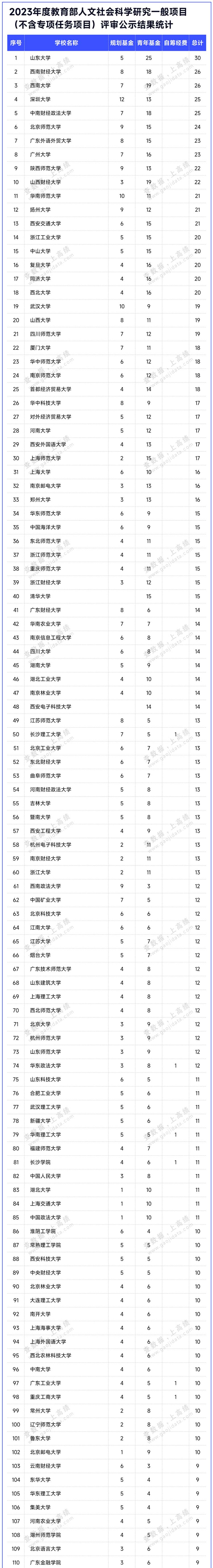 在規(guī)劃基金、青年基金、自籌經(jīng)費(fèi)項(xiàng)目,西部和邊疆地區(qū)項(xiàng)目,新疆項(xiàng)目,西藏項(xiàng)目4項(xiàng)項(xiàng)目評(píng)審公示結(jié)果中,山東大學(xué)共30項(xiàng),為入選項(xiàng)目最多的高校;其次是西南財(cái)經(jīng)大學(xué)和西南大學(xué),入選26項(xiàng)。入選20個(gè)及20個(gè)以上項(xiàng)目的高校還有深圳大學(xué)、中南財(cái)經(jīng)政法大學(xué)、北京師范大學(xué)、廣東外語(yǔ)外貿(mào)大學(xué)、廣州大學(xué)、陜西師范大學(xué)、山西財(cái)經(jīng)大學(xué)、華南師范大學(xué)、揚(yáng)州大學(xué)、西安交通大學(xué)、浙江工業(yè)大學(xué)、中山大學(xué)、復(fù)旦大學(xué)、同濟(jì)大學(xué)和西北大學(xué)。