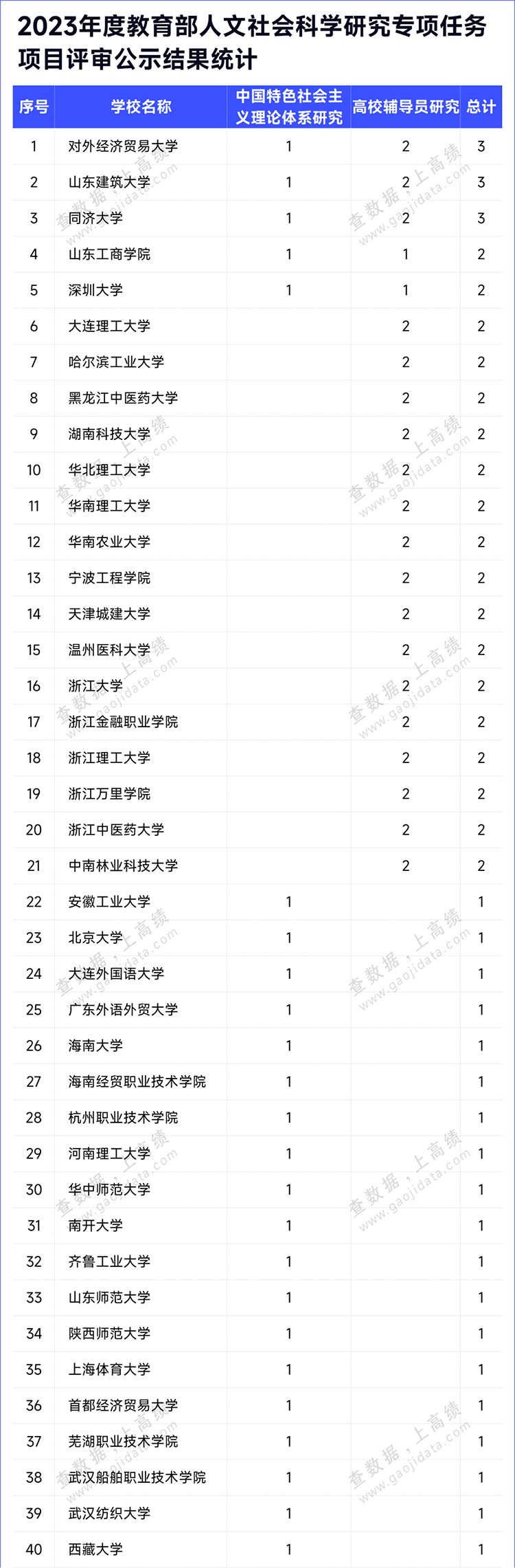 2023年度教育部人文社會(huì)科學(xué)研究專項(xiàng)任務(wù)項(xiàng)目中,對(duì)外經(jīng)濟(jì)貿(mào)易大學(xué)、山東建筑大學(xué)和同濟(jì)大學(xué)各入選3項(xiàng);山東工商學(xué)院、深圳大學(xué)、大連理工大學(xué)等18所高校各入選2項(xiàng);其余各高校各入選1項(xiàng)。