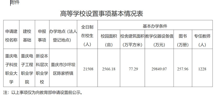10月8日,重慶市教育委員會(huì)對(duì)高等學(xué)校設(shè)置事項(xiàng)進(jìn)行公示:根據(jù)《中華人民共和國高等教育法》《普通高等學(xué)校設(shè)置暫行條例》《本科層次職業(yè)學(xué)校設(shè)置標(biāo)準(zhǔn)(試行)》等有關(guān)規(guī)定要求,經(jīng)市高校設(shè)置評(píng)議委員會(huì)專家考察和評(píng)議,擬向教育部申報(bào)設(shè)置重慶電子科技職業(yè)大學(xué)。