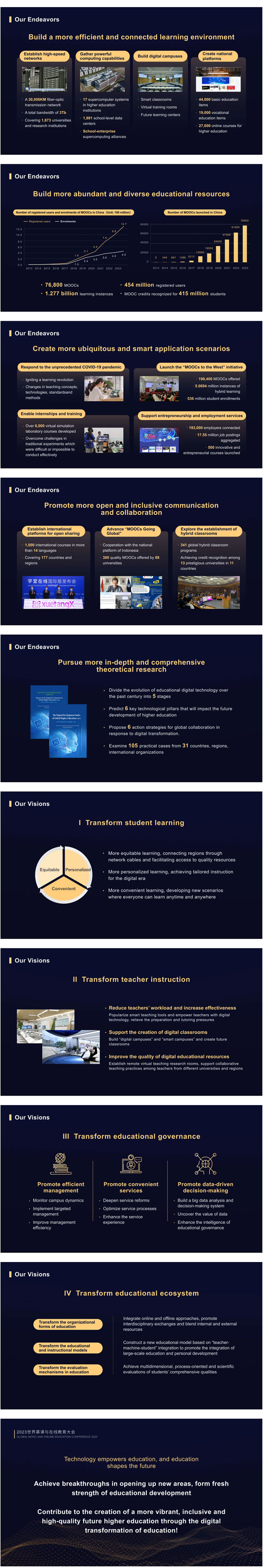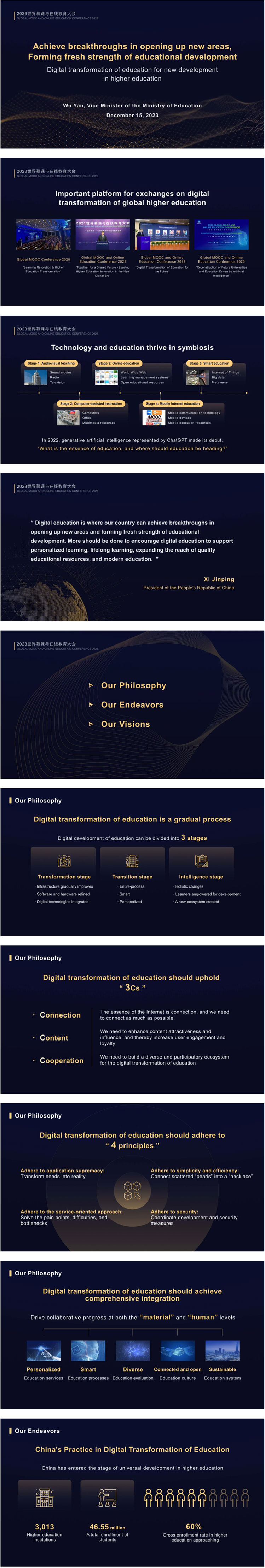 2023年12月15日,教育部副部長(zhǎng)吳巖出席世界慕課與在線教育大會(huì),并作題為《開辟新賽道,尋求新突破——教育數(shù)字化引領(lǐng)高等教育新發(fā)展》的主旨報(bào)告(英文原標(biāo)題為:Achieve breakthroughs in opening up new areas, Forming fresh strength of educational development —— Digital transformation of education for new development in higher education)。以下為PPT全文。