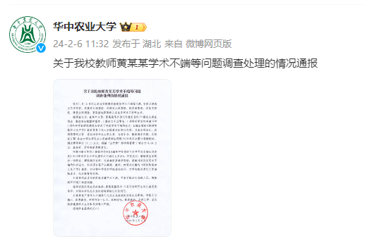 2月6日,華中農(nóng)業(yè)大學(xué)通報(bào)教師黃某某學(xué)術(shù)不端等問(wèn)題調(diào)查處理情況。具體如下: