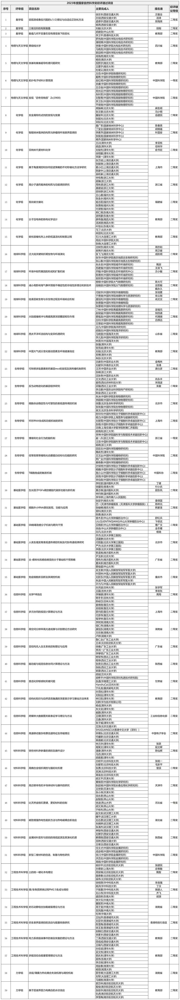 2023年度國家科學(xué)技術(shù)獎初評工作已經(jīng)結(jié)束?,F(xiàn)將初評通過的59項國家自然科學(xué)獎項目、52項國家技術(shù)發(fā)明獎通用項目、132項國家科學(xué)技術(shù)進(jìn)步獎通用項目,在國家科技管理信息系統(tǒng)公共服務(wù)平臺(https://service.most.gov.cn/jl)公布。初評通過的19項國家技術(shù)發(fā)明獎專用項目和39項國家科學(xué)技術(shù)進(jìn)步獎專用項目在委托管理單位、提名單位及項目完成單位等進(jìn)行內(nèi)部公布。