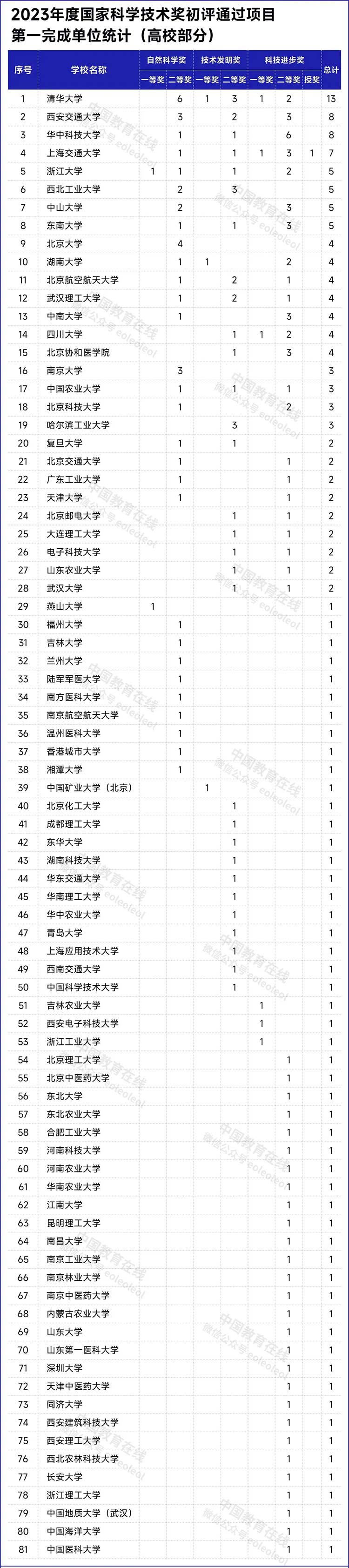 國家科學(xué)技術(shù)進(jìn)步獎項目中,清華大學(xué)、上海交通大學(xué)、四川大學(xué)、吉林農(nóng)業(yè)大學(xué)、西安電子科技大學(xué)和浙江工業(yè)大學(xué)各有1項初評建議等級為一等獎。