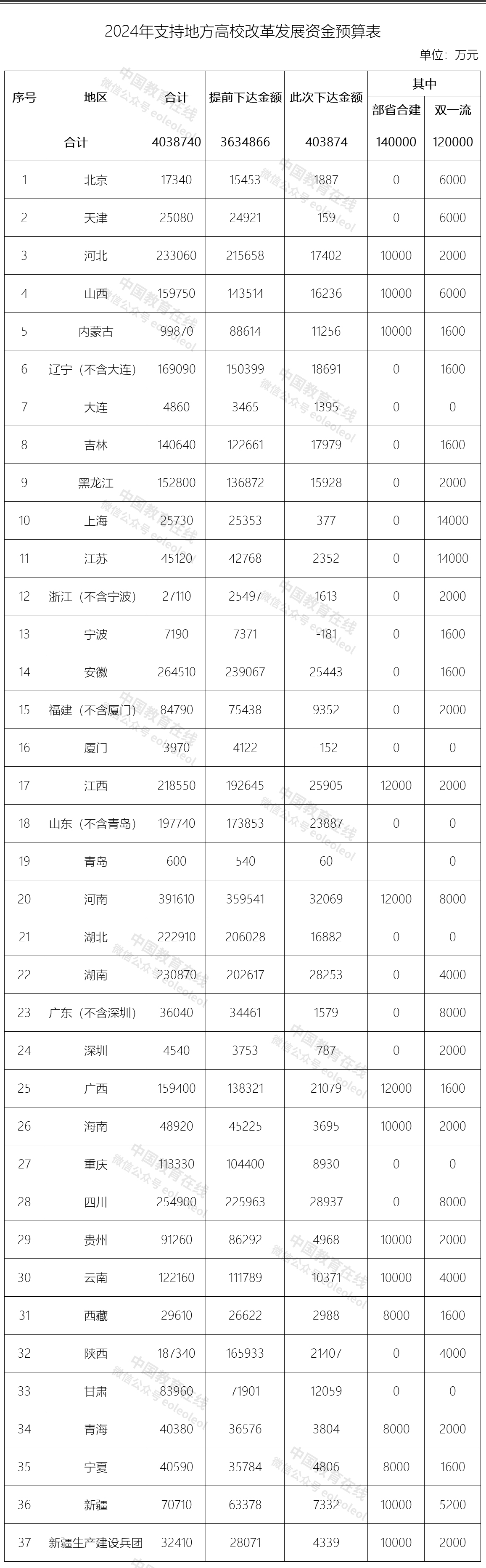 近日,財政部印發(fā)《關(guān)于下達2024年支持地方高校改革發(fā)展資金預(yù)算的通知》。此次下達金額約40.4億元,加上提前下達金額約363.5億元,合計下達預(yù)算約403.9億元。