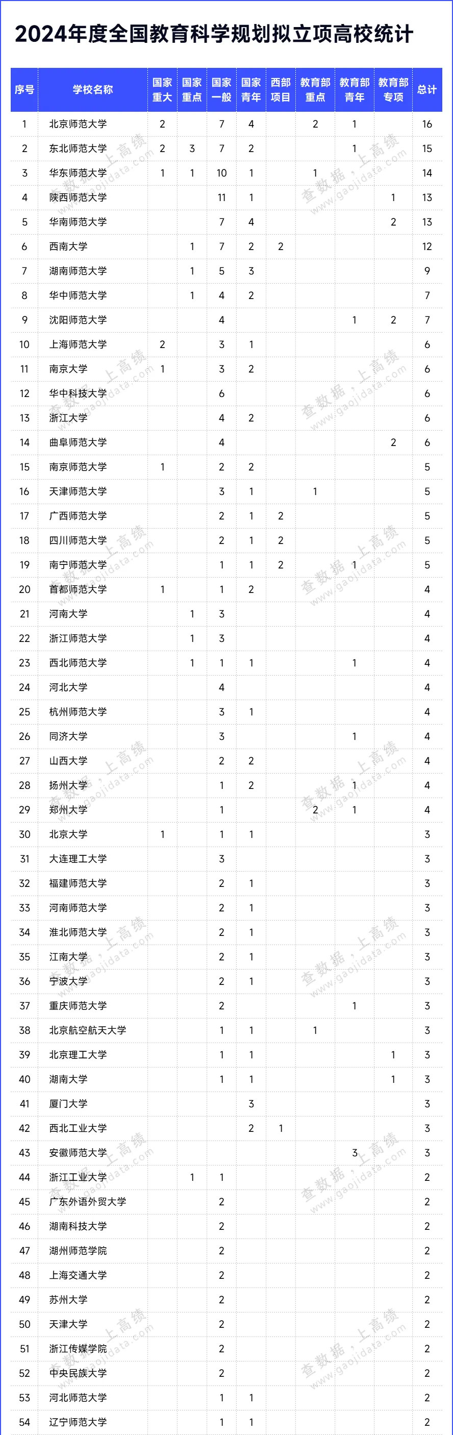據(jù)統(tǒng)計,此次全國教育科學(xué)規(guī)劃2024年度課題擬立項(xiàng)名單中,高校共407項(xiàng)課題擬獲立項(xiàng)資助。擬立項(xiàng)課題最多的是北京師范大學(xué),擬立項(xiàng)16個課題。其次是東北師范大學(xué)和華東師范大學(xué),分別擬立項(xiàng)15個和14個課題。