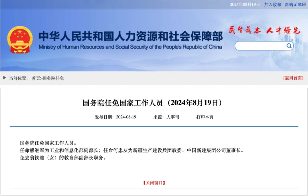 據(jù)人力資源和社會保障部網(wǎng)站8月19日消息,國務(wù)院任免國家工作人員:
