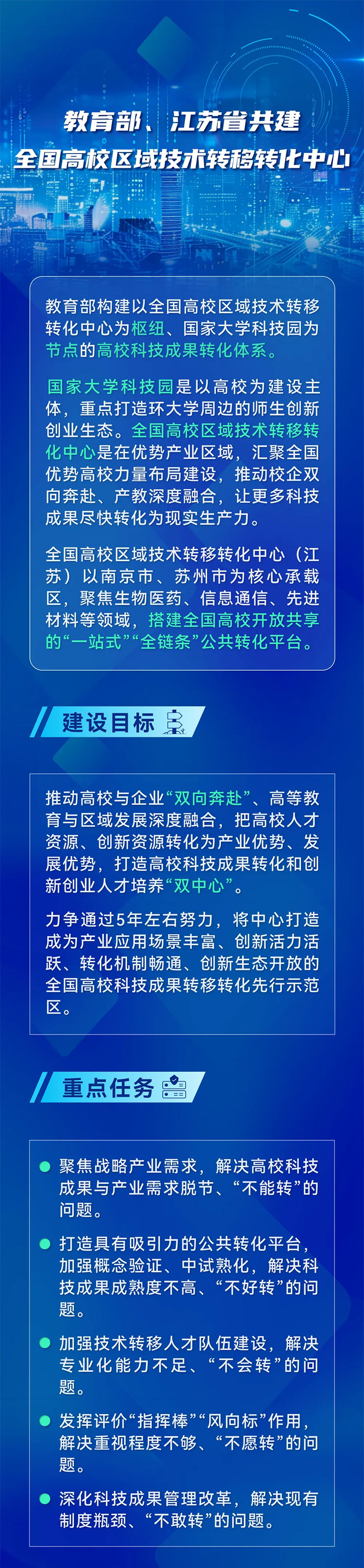 剛剛閉幕的全國(guó)教育大會(huì)對(duì)高??萍汲晒D(zhuǎn)化作出重要部署,強(qiáng)調(diào)讓更多科技成果盡快轉(zhuǎn)化為現(xiàn)實(shí)生產(chǎn)力。9月14日,一項(xiàng)落實(shí)全國(guó)教育大會(huì)精神,劍指高??萍汲晒D(zhuǎn)化關(guān)鍵難題的重大舉措落地——教育部、江蘇省共建首個(gè)全國(guó)高校區(qū)域技術(shù)轉(zhuǎn)移轉(zhuǎn)化中心(以下簡(jiǎn)稱“區(qū)域中心”),拉開(kāi)新時(shí)期推進(jìn)高??萍汲晒D(zhuǎn)化的序幕。一起來(lái)看一圖解讀——