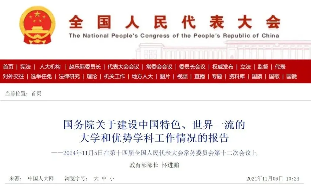 我受國務(wù)院委托,向全國人大常委會報(bào)告建設(shè)中國特色、世界一流的大學(xué)和優(yōu)勢學(xué)科工作情況,請審議。
