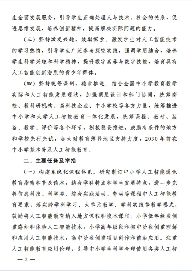 通知強調(diào),要加強頂層設計和部門協(xié)同,統(tǒng)籌推進中小學和大學人工智能教育一體化發(fā)展,2030年前在中小學基本普及人工智能教育。
