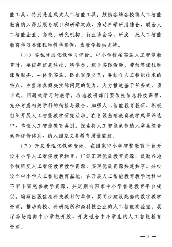 通知列出了人工智能教育的六大主要任務和舉措,包括構建系統(tǒng)化課程體系、實施常態(tài)化教學與評價、開發(fā)普適化教學資源、建設泛在化教學環(huán)境、推動規(guī)模化教師供給和組織多樣化交流活動。
