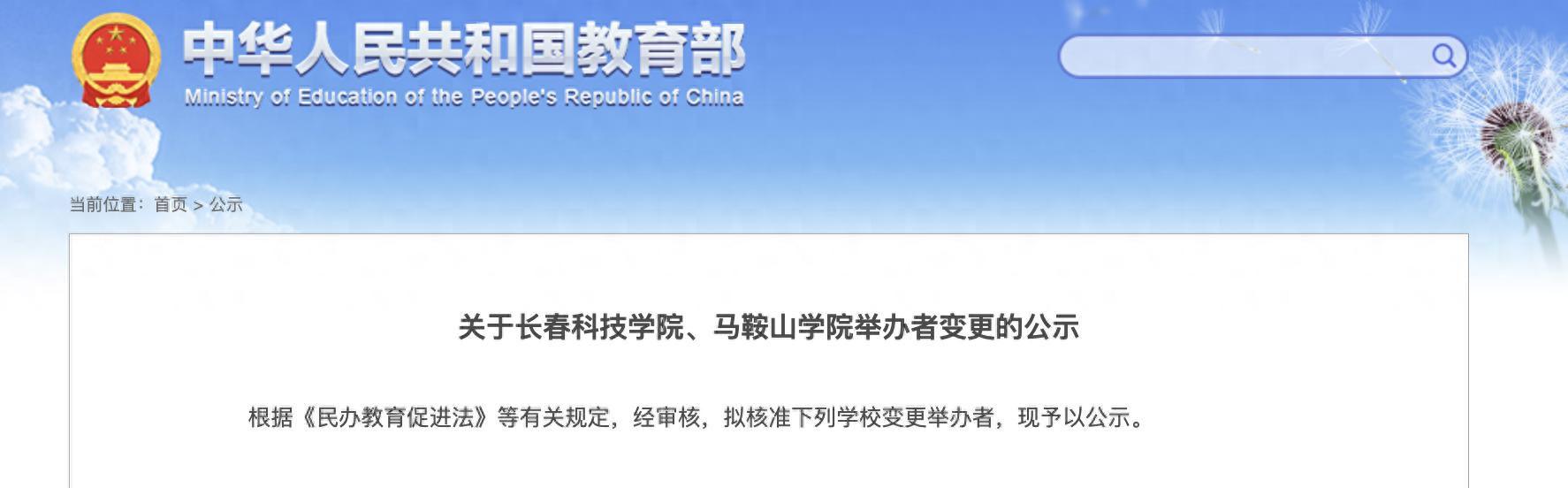12月2日,教育部網(wǎng)站發(fā)布《關(guān)于長(zhǎng)春科技學(xué)院、馬鞍山學(xué)院舉辦者變更的公示》。