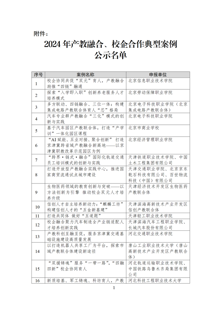 根據(jù)《關(guān)于征集產(chǎn)教融合、校企合作典型案例的通知》要求,在各省級教育行政部門、各計劃單列市教育局推薦的基礎(chǔ)上,經(jīng)資格審查、專家評議等程序,擬確定133個產(chǎn)教融合、校企合作典型案例(排名不分先后,名單見附件),現(xiàn)予以公示,公示期為2024年12月10日至12月16日。