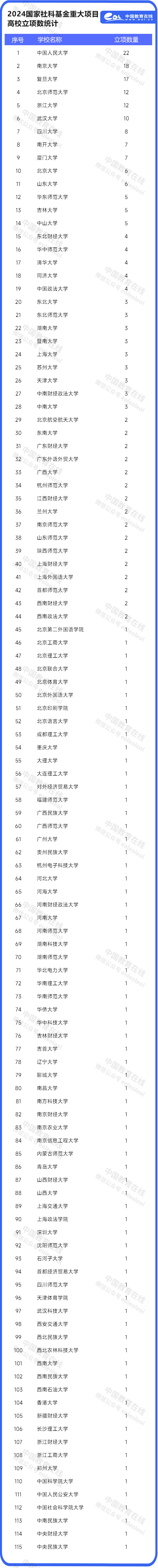 據(jù)統(tǒng)計(jì),此次公布的名單中,責(zé)任單位涉及115所高校。其中,中國人民大學(xué)有22個(gè)項(xiàng)目立項(xiàng),數(shù)量最多;其次是南京大學(xué),有18個(gè)項(xiàng)目立項(xiàng);復(fù)旦大學(xué)立項(xiàng)17項(xiàng),位列第三。