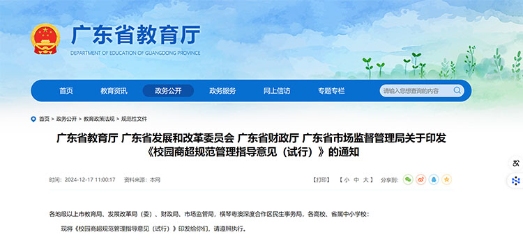 近日,廣東省教育廳等四部門發(fā)布《校園商超規(guī)范管理指導(dǎo)意見(jiàn)(試行)》。明確提出,中小學(xué)、幼兒園一般不得在校內(nèi)設(shè)置校園商超,已經(jīng)設(shè)置的,要逐步退出。寄宿制中小學(xué)可根據(jù)學(xué)校實(shí)際需求,征求家委會(huì)和學(xué)生代表意見(jiàn)后,經(jīng)學(xué)校領(lǐng)導(dǎo)班子、校代會(huì)或教代會(huì)等方式集體討論后決定。