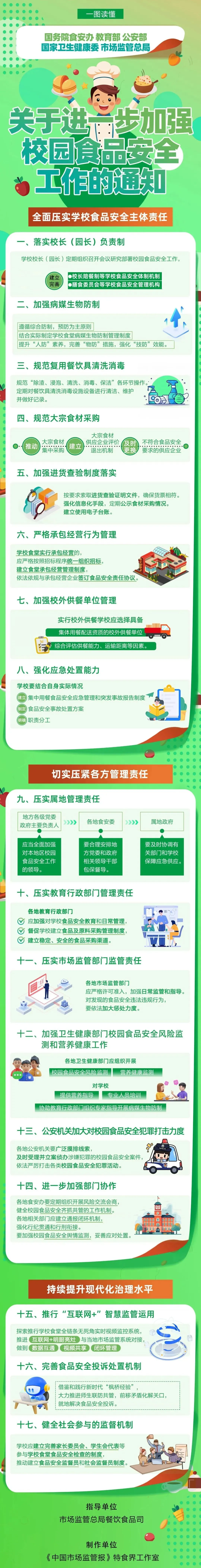 《通知》強調(diào),地方各級黨委和政府主要負責(zé)人應(yīng)當(dāng)全面加強對本地區(qū)校園食品安全工作的領(lǐng)導(dǎo)。各地食安辦、教育行政部門、衛(wèi)生健康部門、公安機關(guān)、市場監(jiān)管部門要依職責(zé)加強校園食品安全工作,強化部門協(xié)作,定期組織開展風(fēng)險交流會商,健全校園食品安全齊抓共管的工作機制。