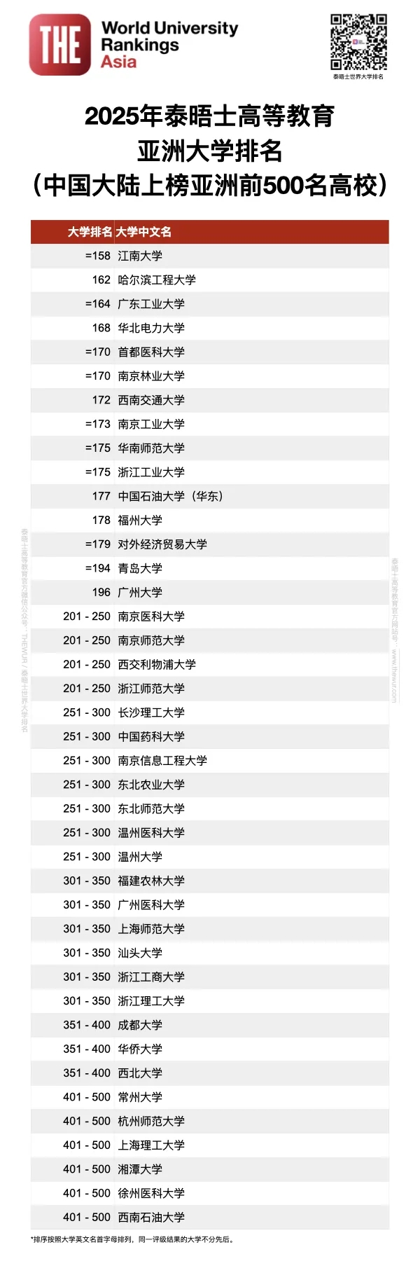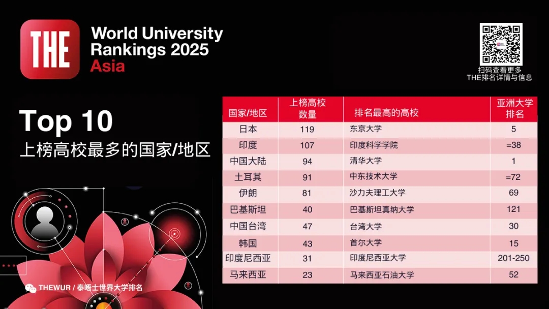 在2025 年泰晤士高等教育亞洲大學(xué)排名中,中國大陸高校獨占鰲頭,清華大學(xué)第七年蟬聯(lián)第一,五所中國大陸高校進入前十名,上榜高校中有近三分之一的排名有所提升。