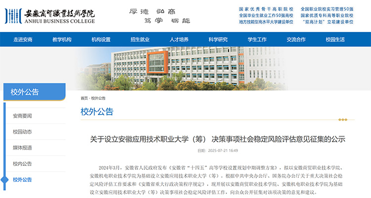 7月21日,安徽商貿(mào)職業(yè)技術(shù)學(xué)院官網(wǎng)發(fā)布“關(guān)于設(shè)立安徽應(yīng)用技術(shù)職業(yè)大學(xué)(籌) 決策事項社會穩(wěn)定風(fēng)險評估意見征集的公示”。