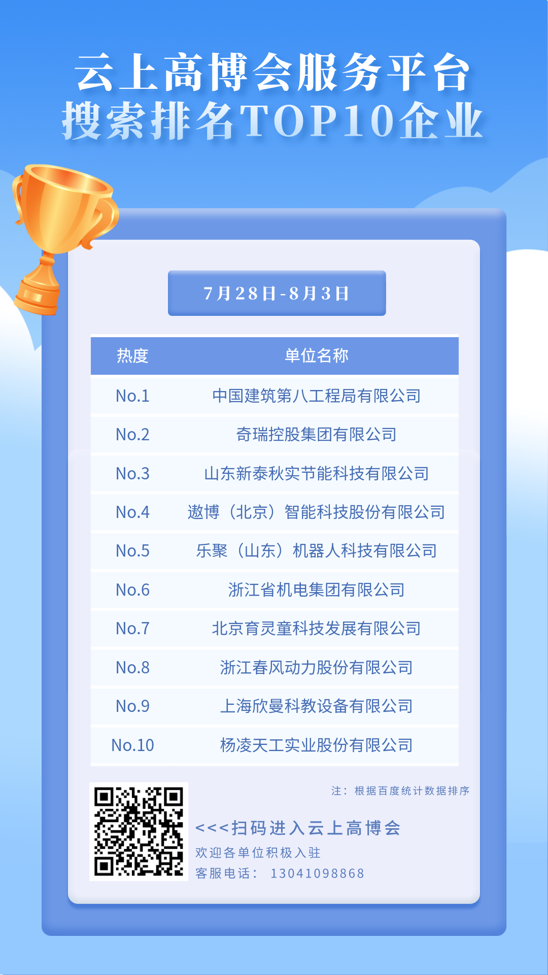 8月4日,云上高博會服務平臺推出7月28日-8月3日搜索熱門榜單。該榜單依托百度統(tǒng)計數(shù)據(jù),綜合網(wǎng)站搜索熱度與訪問量,分別篩選出企業(yè)、高校TOP10名單。