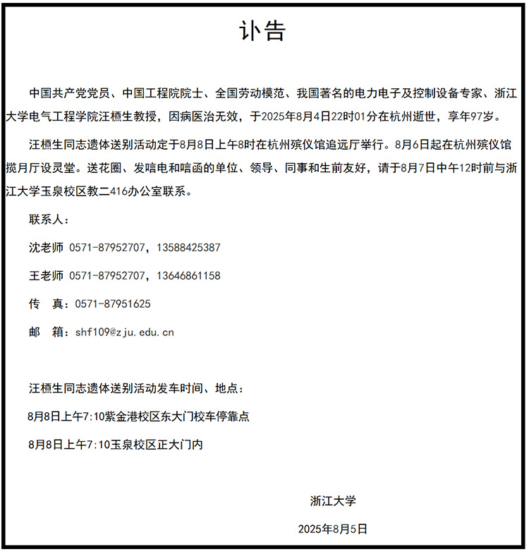 8月5日,浙江大學(xué)電氣工程學(xué)院發(fā)布訃告:中國共產(chǎn)黨黨員、中國工程院院士、全國勞動模范、我國著名的電力電子及控制設(shè)備專家、浙江大學(xué)電氣工程學(xué)院汪槱生教授,因病醫(yī)治無效,于2025年8月4日22時01分在杭州逝世,享年97歲。