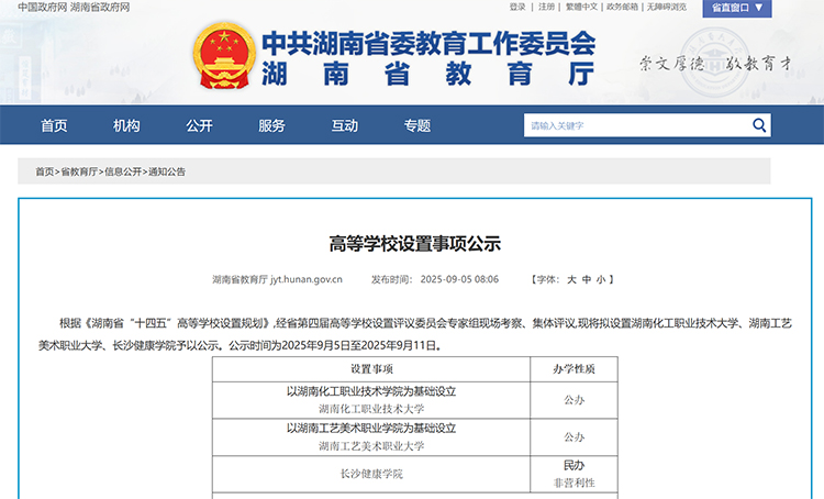 9月5日,湖南省教育廳發(fā)布《高等學(xué)校設(shè)置事項(xiàng)公示》,根據(jù)《湖南省“十四五”高等學(xué)校設(shè)置規(guī)劃》,經(jīng)省第四屆高等學(xué)校設(shè)置評議委員會(huì)專家組現(xiàn)場考察、集體評議,將擬設(shè)置湖南化工職業(yè)技術(shù)大學(xué)、湖南工藝美術(shù)職業(yè)大學(xué)、長沙健康學(xué)院。