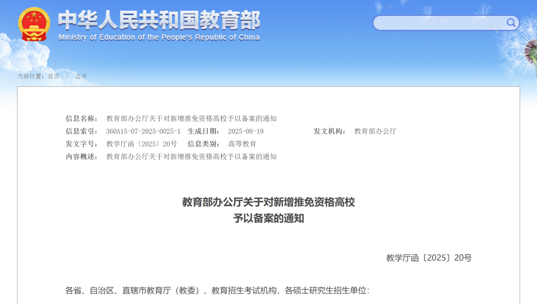 9月12日,教育部辦公廳發(fā)布《關(guān)于對新增推免資格高校予以備案的通知》。