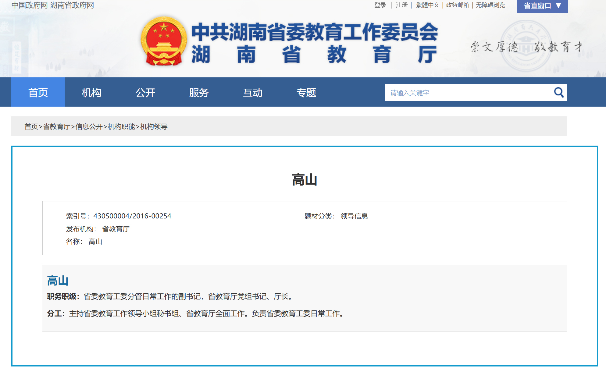湖南省教育廳官網(wǎng)日前更新顯示,高山已任省委教育工委分管日常工作的副書(shū)記,省教育廳黨組書(shū)記、廳長(zhǎng)。主持省委教育工作領(lǐng)導(dǎo)小組秘書(shū)組、省教育廳全面工作。負(fù)責(zé)省委教育工委日常工作。