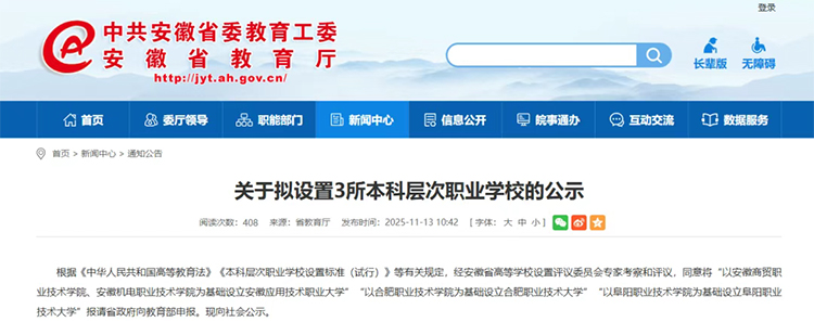 11月13日,安徽省教育廳發(fā)布《關(guān)于擬設(shè)置3所本科層次職業(yè)學(xué)校的公示》。