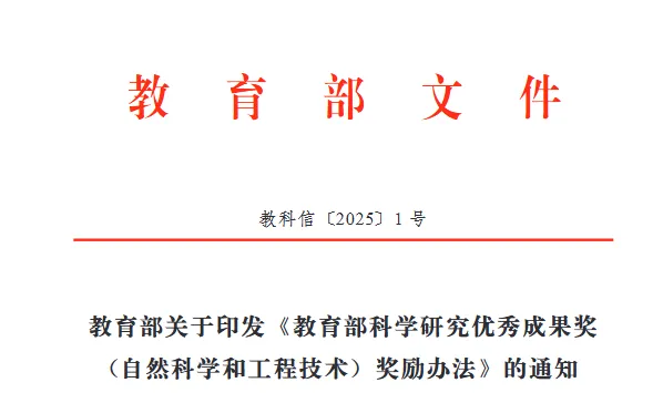 近日,從多所高校官網(wǎng)處獲悉,教育部印發(fā)《教育部科學研究優(yōu)秀成果獎 (自然科學和工程技術(shù))獎勵辦法》的通知。本辦法自2025年12月1日起施行,2019年11月印發(fā)的《高等學??茖W研究優(yōu)秀成果獎(科學技術(shù))獎勵辦法》(教技〔2019〕3號)同時廢止。