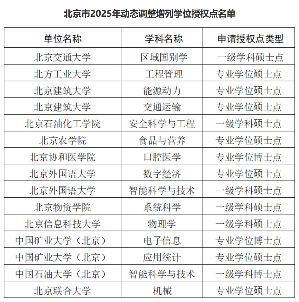 近日,經(jīng)北京市學(xué)位委員會(huì)委員會(huì)議審議,通過了2025年動(dòng)態(tài)調(diào)整增列的碩士學(xué)位授權(quán)點(diǎn)名單。目前名單正在進(jìn)行公示,公示期為10個(gè)工作日(2025年12月5日至12月14日)。