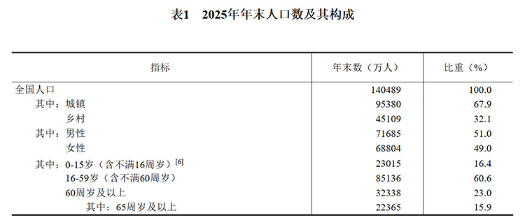 2月28日,國(guó)家統(tǒng)計(jì)局發(fā)布《中華人民共和國(guó)2025年國(guó)民經(jīng)濟(jì)和社會(huì)發(fā)展統(tǒng)計(jì)公報(bào)》。公報(bào)顯示:2025年末全國(guó)人口140489萬人,比上年末減少339萬人,其中城鎮(zhèn)常住人口95380萬人。全年出生人口792萬人,出生率為5.63‰;死亡人口1131萬人,死亡率為8.04‰;自然增長(zhǎng)率為-2.41‰。