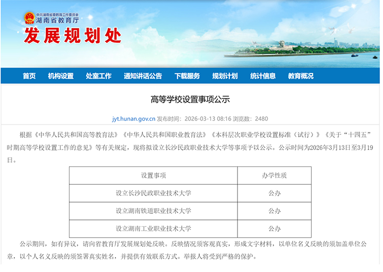 3月13日,湖南省教育廳發(fā)展規(guī)劃處發(fā)布《高等學校設置事項公示》。根據(jù)《中華人民共和國高等教育法》《中華人民共和國職業(yè)教育法》《本科層次職業(yè)學校設置標準(試行)》《關于“十四五”時期高等學校設置工作的意見》等有關規(guī)定,現(xiàn)將擬設立長沙民政職業(yè)技術大學、湖南鐵道職業(yè)技術大學、湖南工業(yè)職業(yè)技術大學事項予以公示。