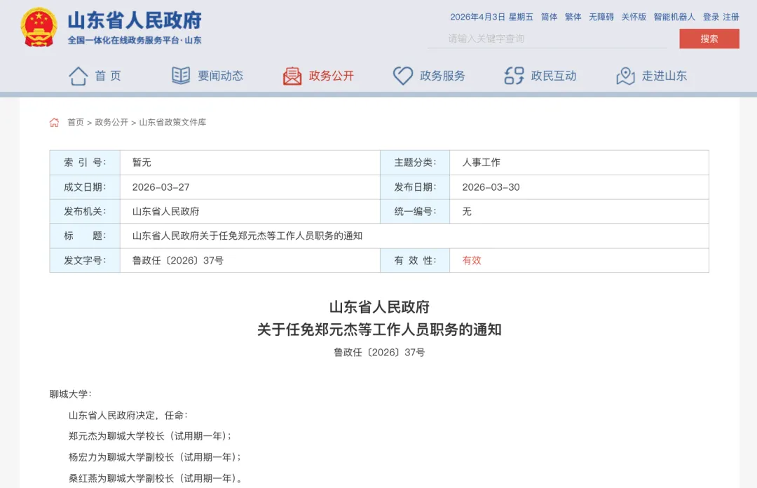 近日,山東省人民政府發(fā)布最新人事任免,其中涉及聊城大學(xué)、山東農(nóng)業(yè)工程學(xué)院、臨沂職業(yè)學(xué)院、山東交通學(xué)院、山東管理學(xué)院、聊城科技職業(yè)學(xué)院等多所高校領(lǐng)導(dǎo)班子調(diào)整。