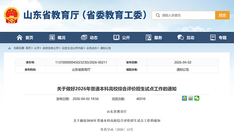 近日,山東省教育廳發(fā)布《關(guān)于做好2026年普通本科高校綜合評價招生試點工作的通知》。今年山東綜合評價招生試點高校為10所,分別是:山東大學(xué)、中國海洋大學(xué)、中國石油大學(xué)(華東)、哈爾濱工業(yè)大學(xué)(威海)、青島大學(xué)、山東師范大學(xué)、山東科技大學(xué)、青島科技大學(xué)、山東財經(jīng)大學(xué)、華南理工大學(xué)。