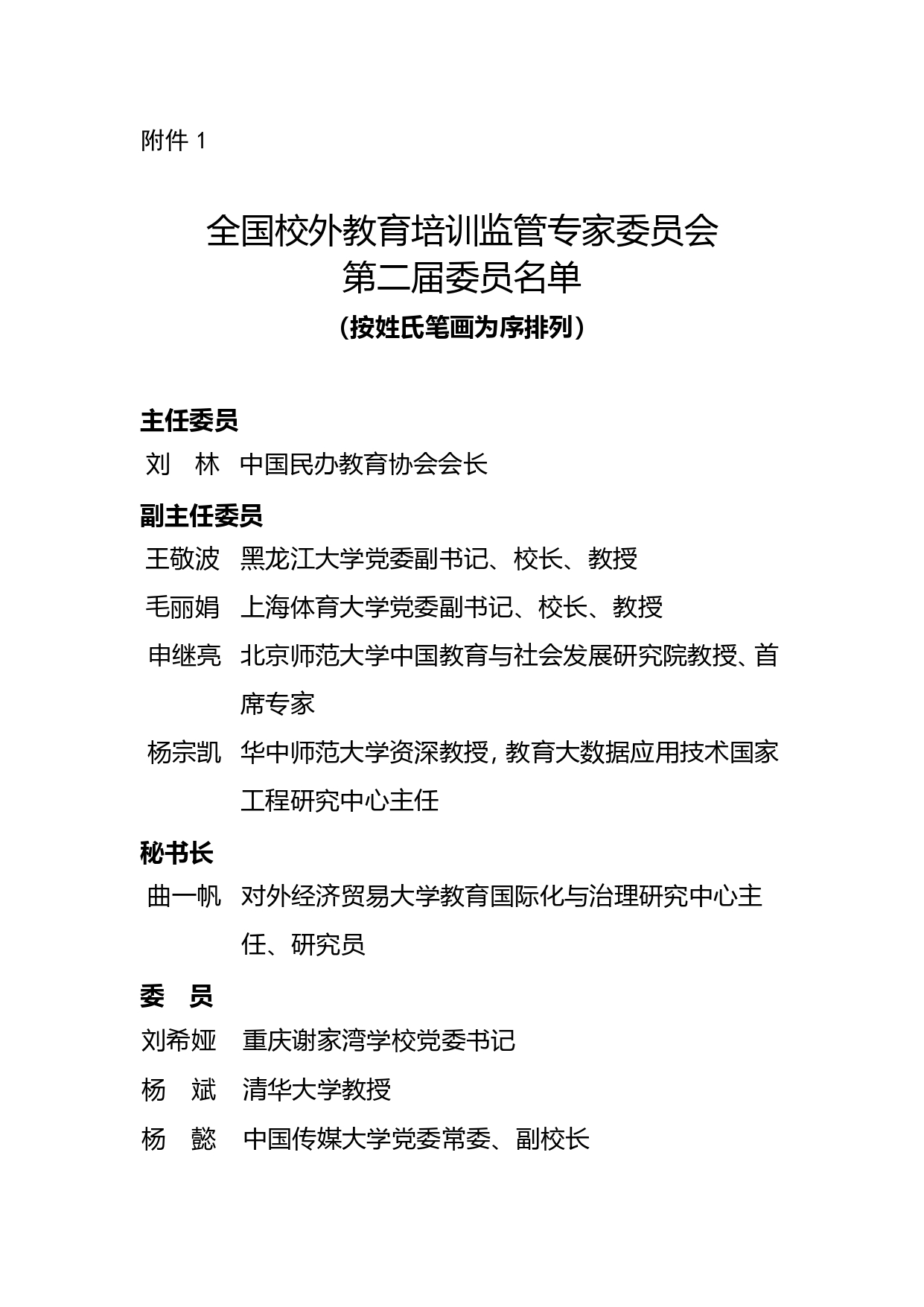 1.全國校外教育培訓監(jiān)管專家委員會第二屆委員名單