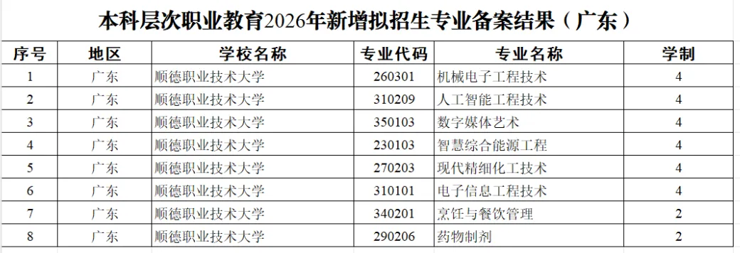 日前,教育部辦公廳公布了2026年本科層次職業(yè)教育擬招生專業(yè)設(shè)置備案結(jié)果,順德職業(yè)技術(shù)大學(xué)申報的機械電子工程技術(shù)、人工智能工程技術(shù)、數(shù)字媒體藝術(shù)、智慧綜合能源工程、現(xiàn)代精細化工技術(shù)、電子信息工程技術(shù)、烹飪與餐飲管理、藥物制劑等8個職業(yè)本科專業(yè)獲批。