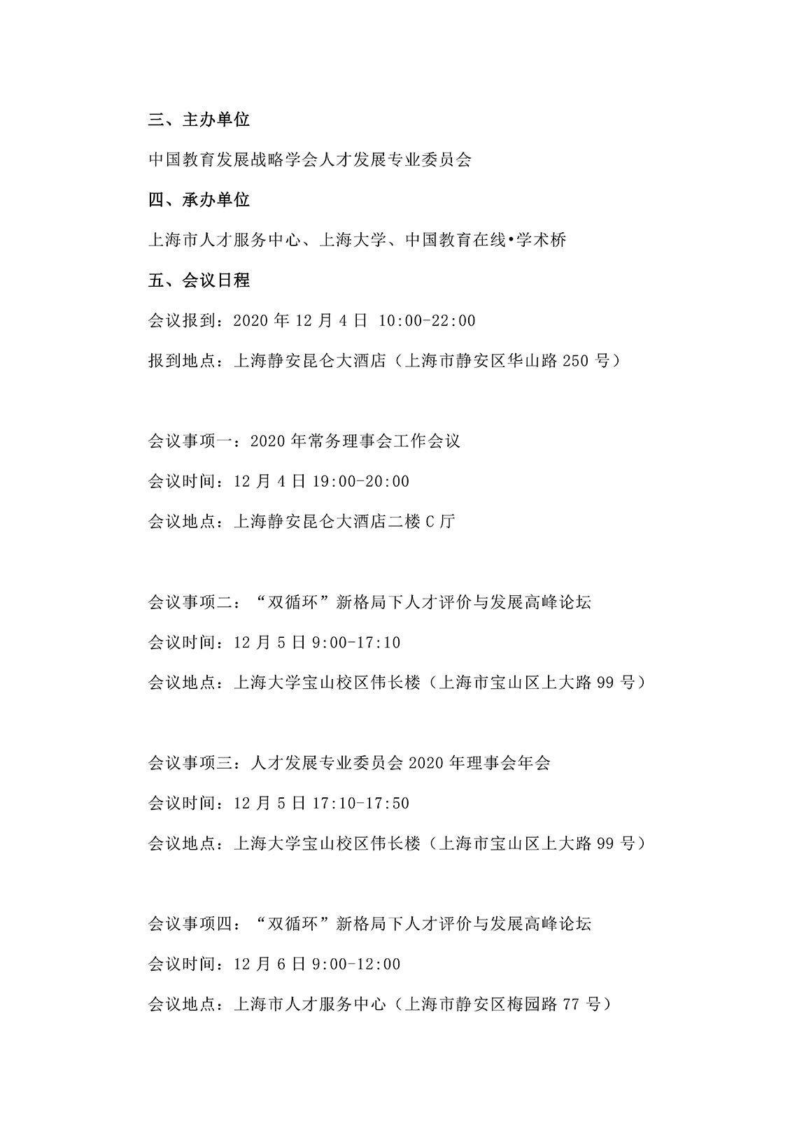 人才發(fā)展專業(yè)委員會(huì)定于2020年12月4-6日在上海召開2020年理事年會(huì)、學(xué)術(shù)年會(huì)暨“雙循環(huán)”新格局下人才評價(jià)與人才發(fā)展高峰論壇,請各會(huì)員單位及有關(guān)單位報(bào)名參會(huì)?,F(xiàn)將有關(guān)事項(xiàng)通知如下: