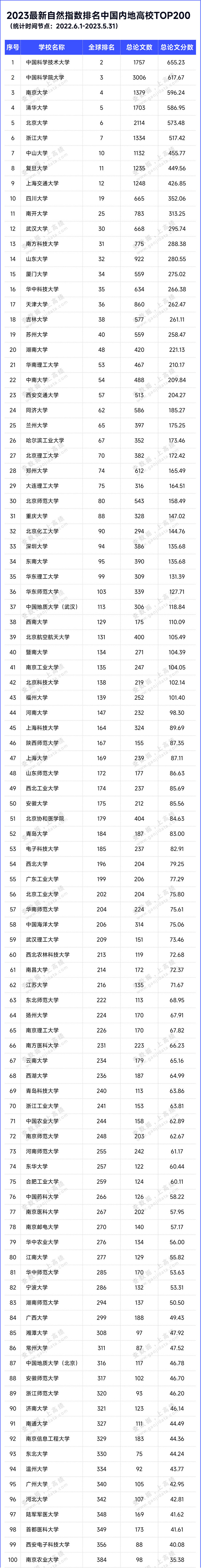 2023最新自然指數(shù)排名中國內地高校TOP200名單(2022.6.1-2023.5.31)如下: