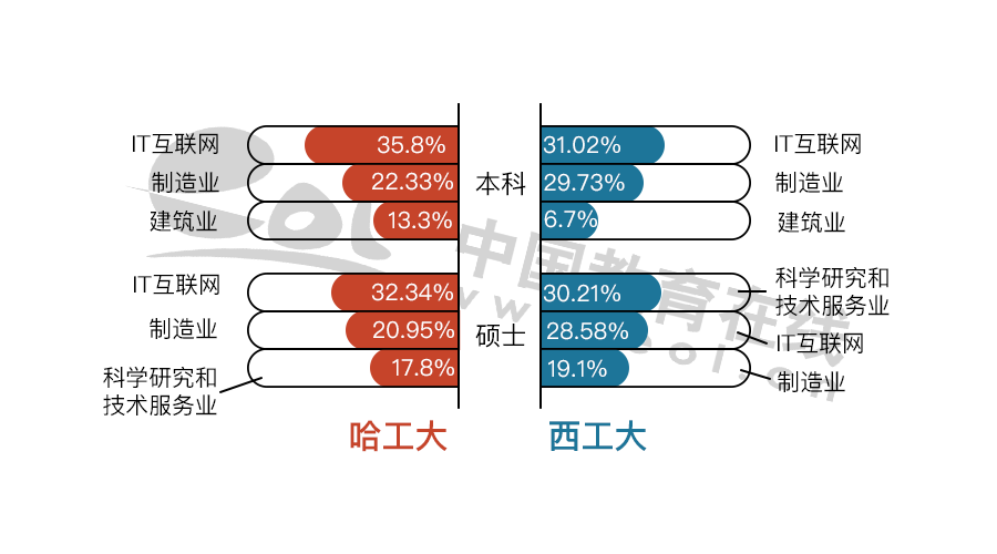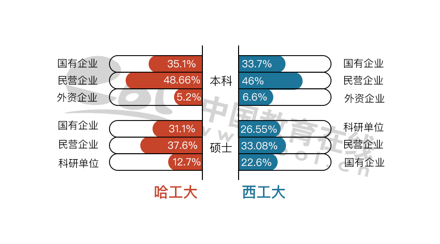 哈工大碩士畢業(yè)生在國(guó)有企業(yè)的比例比西工大高。