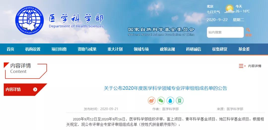 ▲ 國(guó)家自然科學(xué)基金委醫(yī)學(xué)科學(xué)部網(wǎng)站截圖