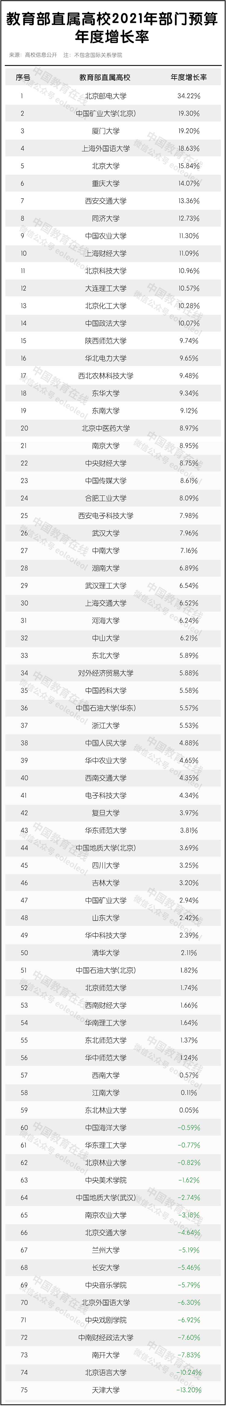 從年度增長(zhǎng)率來看,北京郵電大學(xué)達(dá)到34.22%。13所高校增長(zhǎng)率在10-20%之間。16所高校預(yù)算經(jīng)費(fèi)有所下降。