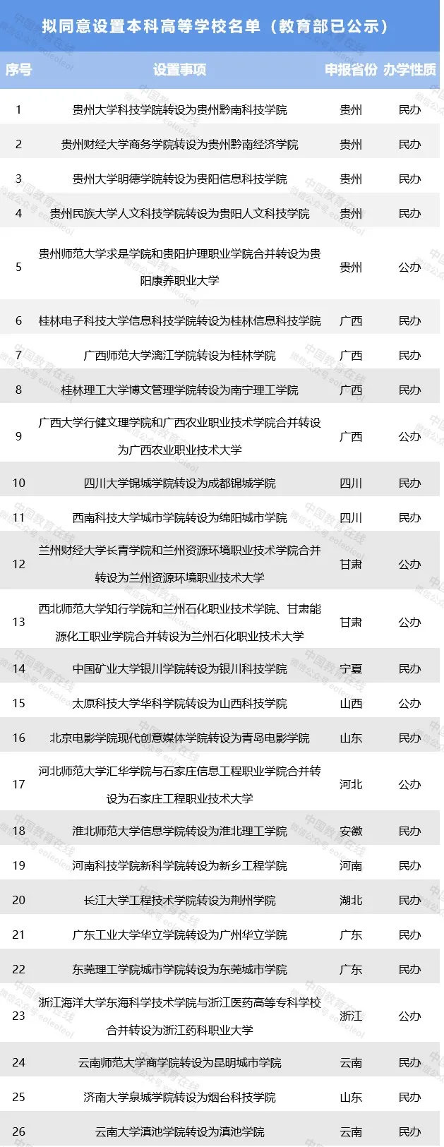 部分高校轉(zhuǎn)設(shè)申請(qǐng)已獲省級(jí)教育廳公示