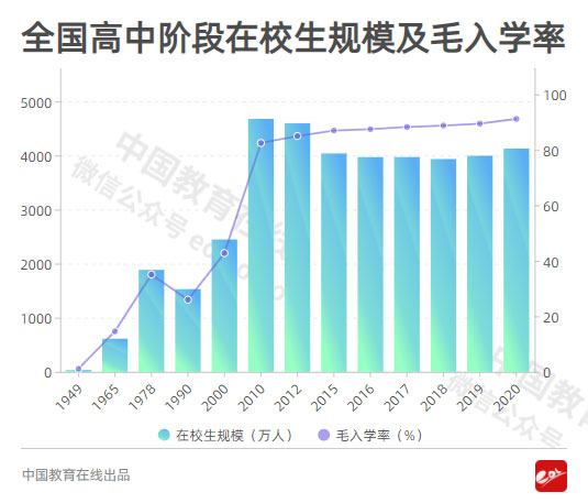 1949年,中國(guó)高中在校學(xué)生數(shù)量為32萬(wàn)人,毛入學(xué)率僅為1.1%。到1965年,高中在校學(xué)生規(guī)模升至613萬(wàn)人 ,毛入學(xué)率14.6%。2000年,全國(guó)高中階段教育共有在校學(xué)生2447萬(wàn)人,毛入學(xué)率42.8%。之后我國(guó)高中階段教育快速發(fā)展,2010年在校學(xué)生數(shù)升至4677萬(wàn)人,毛入學(xué)率也加速提升至82.5%。