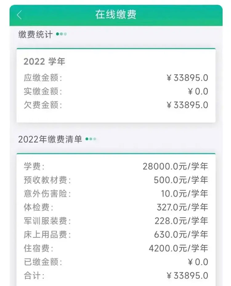 根據(jù)網(wǎng)友曬出的繳費單,某地方民辦本科學(xué)校學(xué)費高達(dá)28000/學(xué)年,總費用合計33895/學(xué)年,其中住宿費就4200。