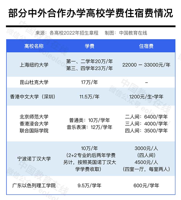 中外合作辦學(xué)高校則是所有大學(xué)類型中收費最高的,動輒十幾二十萬的學(xué)費標(biāo)準(zhǔn),堪比出國留學(xué)的費用。公辦大學(xué)也有中外合作等部分高收費專業(yè),如華中科技大學(xué)生物科學(xué)(中外合作辦學(xué))專業(yè)學(xué)費達(dá)到10.8萬元/年,相比該校普通專業(yè)的學(xué)費堪稱“天價”。
