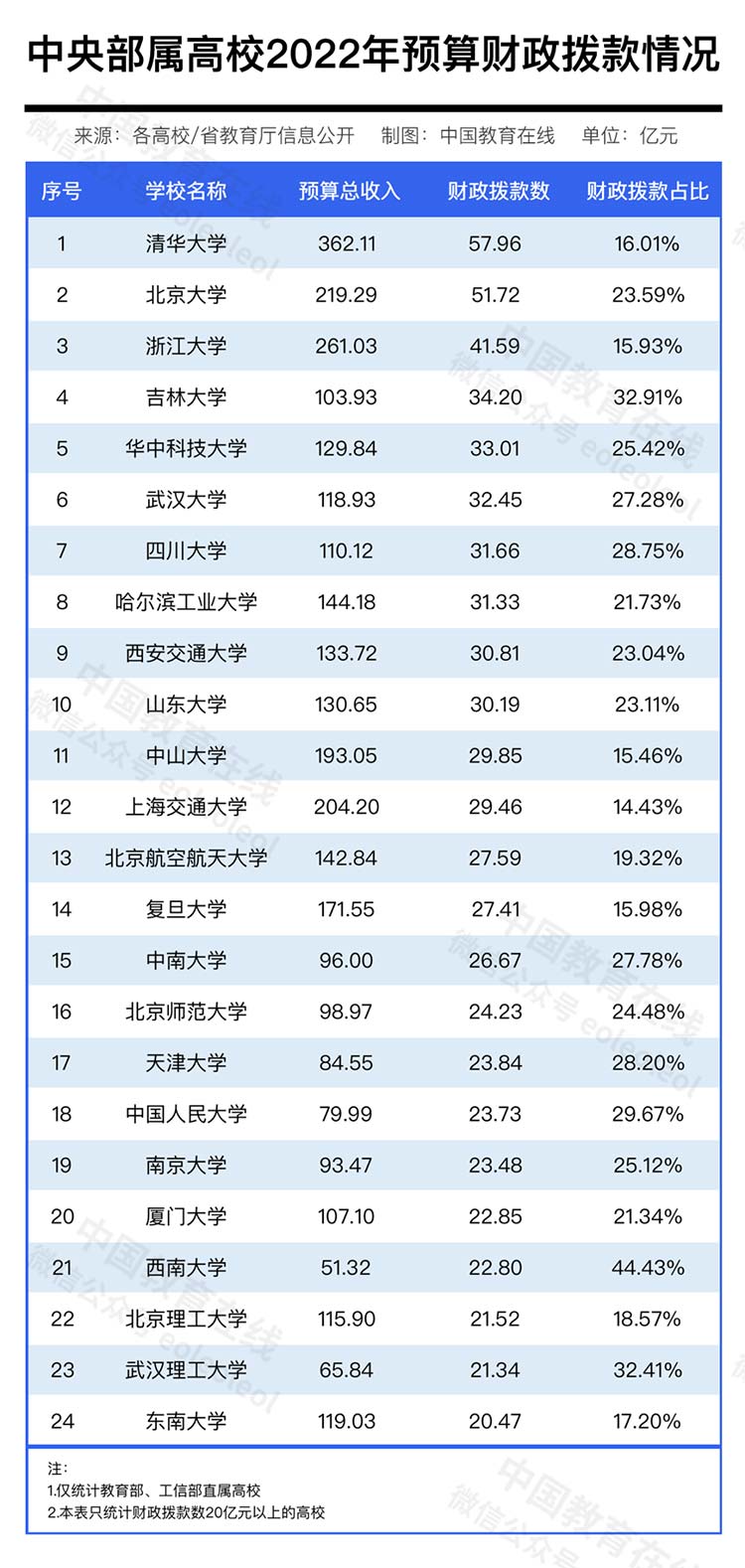 目前我國公辦高等學(xué)校經(jīng)費收入來源主要是財政撥款和學(xué)費收入。在中央部屬高校公布的2022年預(yù)算財政撥款情況中,清華大學(xué)以中央財政撥款57.96億元排在首位,北京大學(xué)51.72億元緊隨其后,財政撥款超過20億元的高校達(dá)到24所,絕大多數(shù)都是985高校。