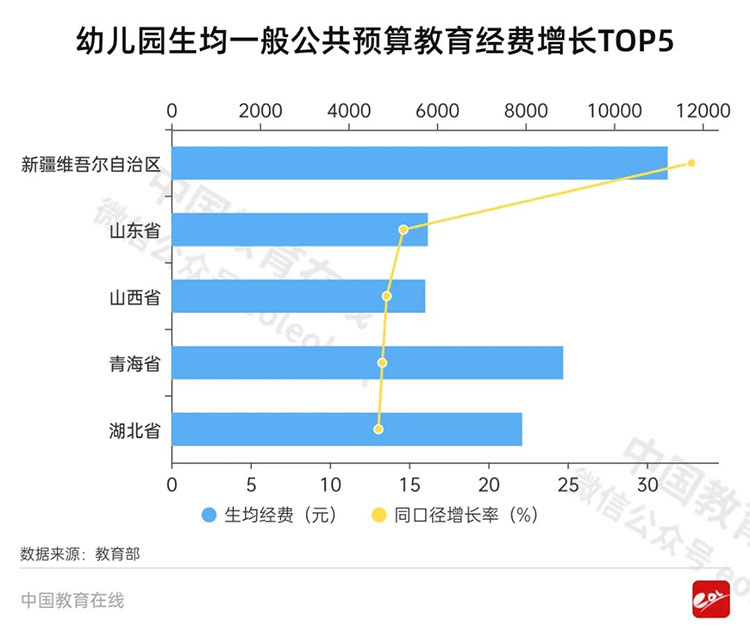 全國幼兒園為9505.84元,同口徑比上年增長4.68%。各省區(qū)市中,增長最快的是新疆維吾爾自治區(qū)(32.81%)。其次為山東省(14.64%)、山西省(13.59%)、青海省(13.31%)、湖北省(13.07%)。